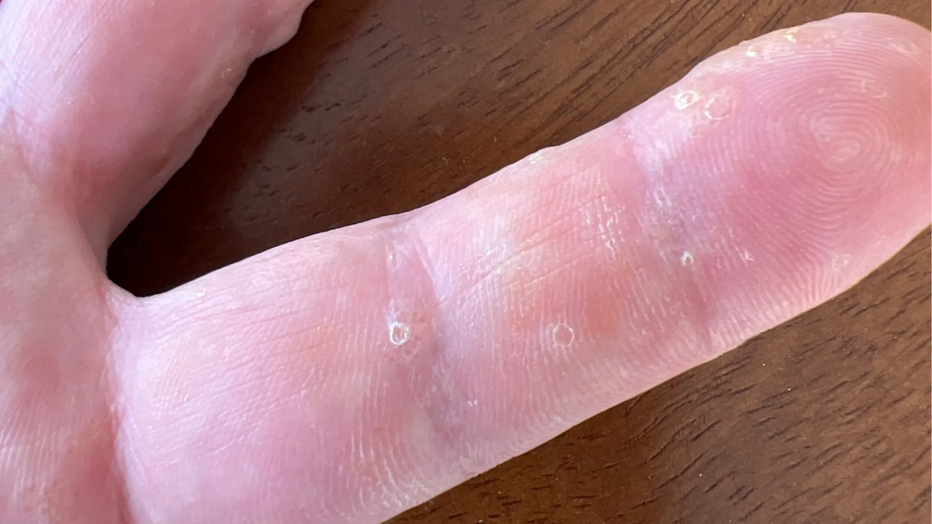 Der Hautausschlag tritt vor allem an Hand- und Fußsohlen auf, wobei sich der Ausschlag deutlich häufiger an den Händen zeigt. Fingerzwischenraum und Handrücken können häufig mitbetroffen sein. Typischerweise zeigen sich kleine, eng gruppierte, juckende Bläschen mit klarer Flüssigkeit. In der Regel zeigen die Bläschen eine Größe von etwas 0,1cm. Bei hoher Entzündungsaktivität können sich die Bläschen vergrößern oder zusammenfließen, was im Fachjargon schließlich als Pompholyx bezeichnet wird. Teilweise können die Bläschen platzen und zum Nässen der betroffenen Stellen führen. Wenn der Hautauschlag länger besteht, kann es zu einer verstärkten Schuppenbildung, sowie zu einer Vergröberung der Haut mit schmerzhaften Rissen kommen. Falls auch Du einen unklaren Hautbefund hast, kannst Du Dich gern an unsere Hautfachärzt*innen aus der digitalen Hautarztpraxis dermanostic per App wenden. Unser Team aus Expert*innen kann Dir bei der Diagnosestellung helfen und erstellt Dir einen ausführlichen Arztbrief.
