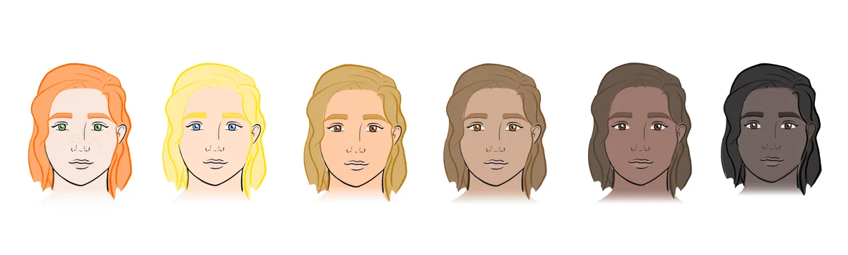 Die folgende Abbildung zeigt Dir einmal die verschiedenen Erscheinungsbilder der Hauttypen 1-6, beginnend mit Typ 1 auf der linken Seite: