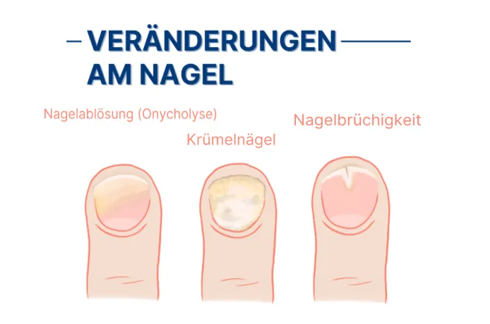 1. Nagel wirkt stumpf und es treten meist noch keine Beschwerden auf 2. Verfärbung der Nagelplatte (gelblich, weißlich, grau-bräunlich) 3. Verdickungen des Nagels und Abhebung des Nagels vom Nagelbett – Gefahr durch Infektion durch Bakterien 4. Rissiger Nagel (brüchig und krümelig) 5. Nagelplatte vollständig zerstört; Gefahr durch Verletzungen, Infektionen und starke Beschwerden beim Gehen